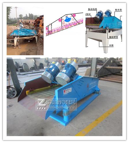 隆中重工TS系列振動脫水篩采用同步方向的振動電機產生激振力,帶動篩箱做近似于圓的運動,從而達到脫水的目的,砂水混合物在聚氨酯篩網上借助振動電機產生的激振力做連續的拋擲運動,拋擲時分層,水和泥等雜質透過篩網落下,砂子由激振力做向前的拋擲運動。